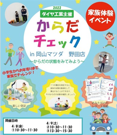 医療用品メーカーのダイヤ工業株式会社(本社:岡山県岡山市 代表:松尾浩紀)は、岡山マツダ野田ショールームにおいて2022年4月8日(金)、4月9日(土)の2日間にコラボイベントの「からだ健康チェックin岡山マツダ」を開催します。