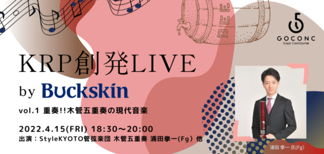 京都リサーチパーク株式会社(代表取締役社長 門脇あつ子)が運営する京都リサーチパーク(以下、KRP地区)西地区10号館1階にあるフードサロンGOCONC(ゴコンク)にて、ドイツビールBuckskin(バックスキン)(株式会社日本サルベージサービス 代表取締役社長 大崎 康弘)と共催で音楽を中心とした定期イベントを4月15日(金)より開催致します。