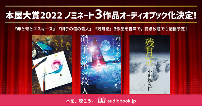 4月6日に発表された「2022年本屋大賞」にて2位となった『赤と青とエスキース』(青山美智子著、PHP研究所刊)、8位となった『硝子の塔の殺人』(知念実希人著、実業之日本社刊)、7位となった『残月記』(小田雅久仁著、双葉社刊)を、当社が運営する会員数が200万人を突破した日本最大級のオーディオブック配信サービス「audiobook.jp」にて2022年5月より順次配信します。