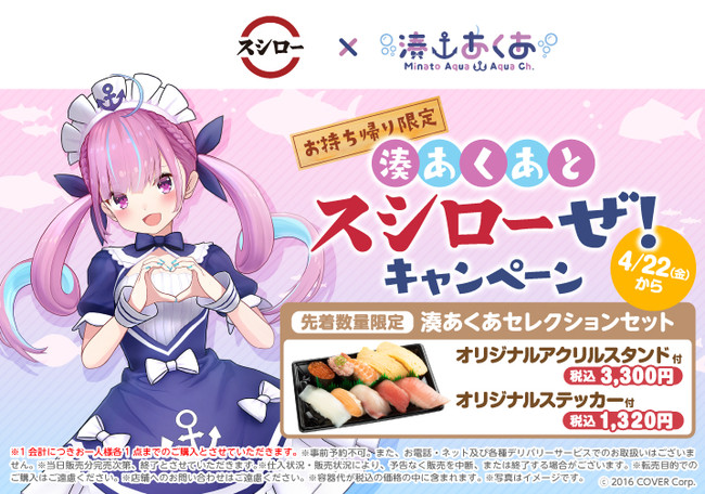 株式会社あきんどスシロー(本社:大阪府吹田市、代表取締役社長:新居 耕平)は、昨今の飲食シーンにおいて多くの生活者の中で中食(なかしょく)を中心とした“新しい生活様式”が定着していることを踏まえ、テイクアウト事業にも力を入れて取り組んでおります。この度、カバー株式会社(本社:東京都千代田区、代表取締役社長:谷郷 元昭)が運営する女性VTuberグループ『ホロライブ』所属の『湊あくあ』さんとコラボレーションしたお持ち帰り限定「湊あくあセレクションセット」を4月22日(金)より、全国※のスシローにて数量限定で販売いたします。