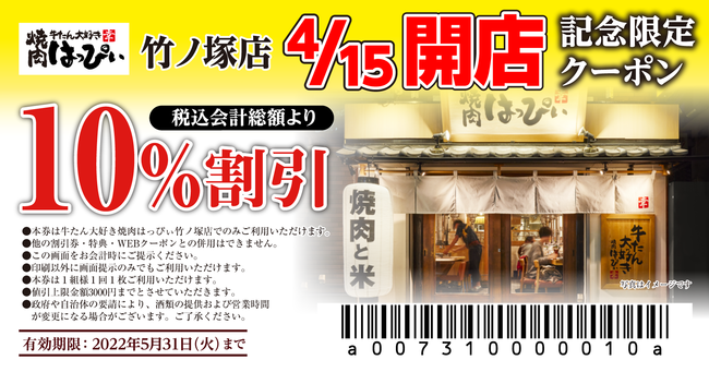 オープン記念として、2022年5月31日(火)まで『牛たん大好き焼肉はっぴぃ竹ノ塚店』でご利用いただける10%割引クーポンを配布します。