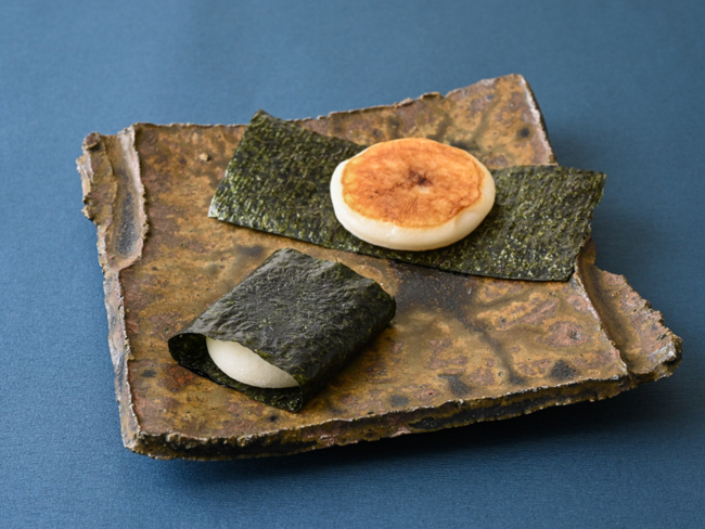 にんべんの鰹節だしと山本海苔店の海苔、榮太樓總本鋪のマンゲツモチを組み合わせた人気商品「日本橋餅」。