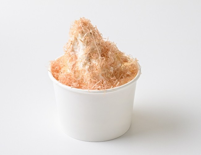 北海道根釧牛乳で仕立てたソフトクリームに、にんべんのふわふわとした糸削りのかつお節をかけました。さらにアクセントとして「本枯鰹節 かつお塩」をひとつまみと榮太樓總本鋪の「みつあめ 有平糖」をトッピング。意外な組み合わせですが、ミルク感が引き立ち、後を引く味わいです。