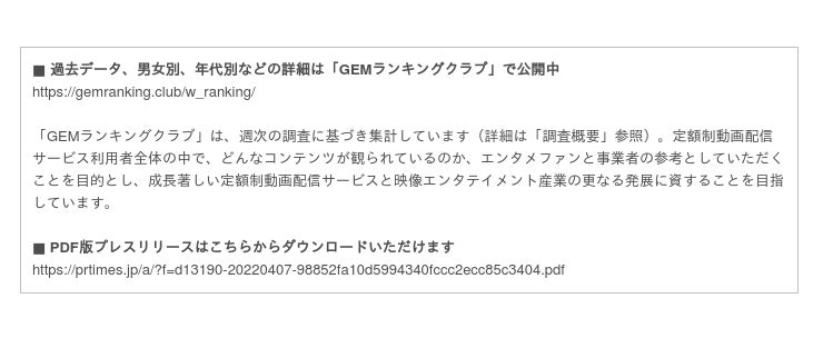 エンタテイメント業界に向けたデータ×デジタルマーケティングサービスを提供するGEM Partners株式会社(ジェムパートナーズ、所在地:東京都港区、代表取締役:梅津文)は4月7日(木)、エンタメコンテンツランキングやデータ情報を発信する「GEMランキングクラブ」プロジェクトにて作成した2022年3月第5週の「定額制動画配信サービス コンテンツ別週間ランキングTOP20(実査日:2022年4月2日、調査対象期間:3月26日~4月1日)」を発表します。