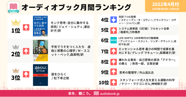 日本一のオーディオブック書籍ラインナップ数(※)を配信する「audiobook.jp」を運営する株式会社オトバンク( 本社:東京都文京区、代表取締役社長:久保田裕也、以下「オトバンク」)は、当社が運営する会員数が200万人を突破した日本最大級のオーディオブック配信サービス「audiobook.jp」におけるオーディオブック月間ランキング4月付(2022/3/1~3/31)を発表します。