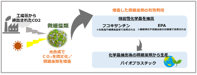 更に、CO2が固定されたバイオマスを活用し、これまで天然資源に依存していた機能性化学品(エイコサペンタエン酸(EPA)注1)やフコキサンチン注2)等)を生産すると共に、有用物質抽出後の残渣は、石油化学プラスチック製品を代替する、環境負荷が低い「バイオプラスチック」等の化成品原料として利用することで、サステイナブルなカーボンリサイクル技術を確立し、社会実装を目指します。