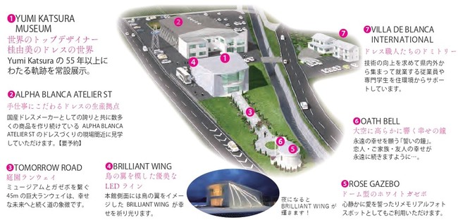 「BRIDAL LAND WAKASA」は、35年にわたり福井県若狭町でユミカツラをはじめとする最高級の国産ウェディングドレスを製造している(株)アルファブランカの自社工場を中核にした、ブライダルをテーマとした複合施設で、「YUMI KATSURA MUSEUM」をはじめ、ドーム型のガゼボ、庭園ランウエイ、cafeレストラン、PHOTOスタジオを併設。工場見学やワークショップによる製作現場体験などもお楽しみ頂けます。