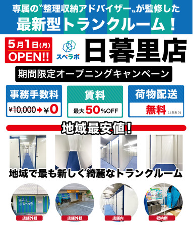 【5月1日(日)オープン】見学から契約、解約まで完全非接触・非対面、お申し込みからご利用まで最短3時間!都内にて絶賛運営中のトランクルーム【スペラボ】が荒川区日暮里に出店!