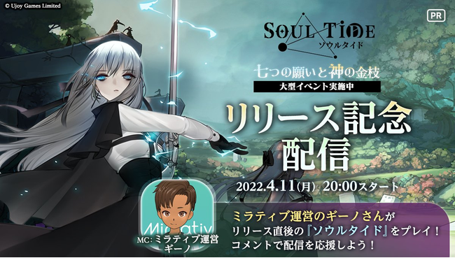 唯一無二の迷宮探索システムや美麗な世界観、魅力溢れるキャラクターにより、配信開始とともに両OSランキング上位を獲得した、新作迷宮探索RPG『ソウルタイド』。現在配信・プレイ動画投稿キャンペーンを実施中で、今夜にはミラティブ運営によるソウルタイドの魅力を解説する生配信も。