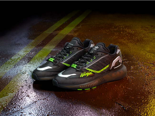 「ZX 5K BOOST KAWASAKI」は、ブラックのTPUオーバーレイとアイステイ、カワサキグリーンのアクセント、半透明のリップストップバンプを組み合わせ、トゥボックスに「Ninja」のロゴをあしらっています。