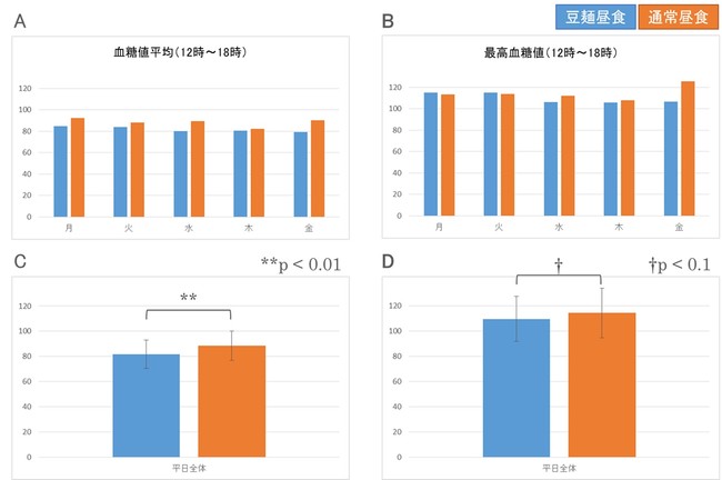 昼食に「豆類でつくった麺」を摂取すると、白米・うどん・パンの摂取と比較して、血糖値平均が有意に低下し、最高血糖値平均は有意傾向ありで低下した。