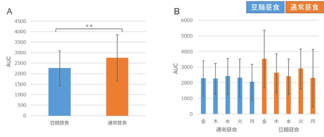昼食に「豆類でつくった麺」を摂取すると、白米・うどん・パンの摂取と比較して、血糖値AUC(曲線下面積)が有意に低くなる。