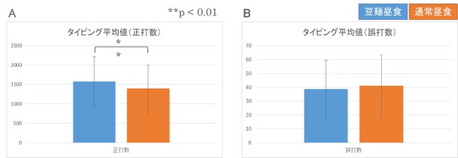 昼食に「豆類でつくった麺」を摂取した場合、白米・うどん・パンの摂取と比較してタイピングの正確さが統計的に有意に増加する一方で、タイピングミスには有意差がない。