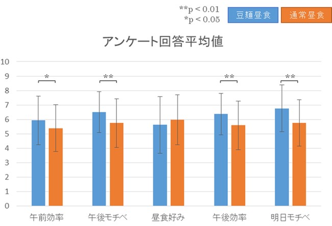 昼食に「豆類でつくった麺」を摂取すると、白米・うどん・パンの摂取と比較して、午前・午後の仕事の効率が有意に高くなり、仕事のモチベーションは午後だけでなく、翌日についても有意に高くなると回答している。