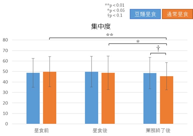 脳波を計測した感性値の結果から、昼食に白米・うどん・パンを摂取すると、昼食前後と比較して定時終了前には「集中度」が有意に低下したが、「豆類でつくった麺」を摂取すると、「集中度」が維持され、低下が防止される。