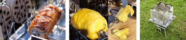 付属のスキュアを使用すればシュラスコなども作れるほか、別売りの「炭火サンマ焼き器」を組み合わせて使用すると魚やイカなども焼けて、調理の幅が広がる。