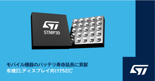 STマイクロエレクトロニクス(NYSE:STM、以下ST)は、アクティブ・マトリクス式の有機EL(AMOLED)ディスプレイ向けに高集積パワー・マネージメントIC(PMIC)「STMP30」を発表しました。同製品は、低暗電流と優れた柔軟性を備え、モバイル機器のバッテリ駆動時間延長に貢献します。