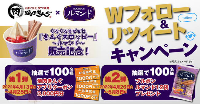 期間中、Twitterの『焼肉きんぐ』と『ブルボン』公式アカウントの両方をフォローし、いずれかのキャンペーンツイートをリツイートいただいた方の中から抽選で100名様に、ブルボン「ルマンド(12袋)」をプレゼントします。