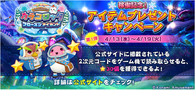 株式会社コナミアミューズメントは、『カラコロッタ フローズンアイランド』にて、本日より「稼働記念!アイテムプレゼントキャンペーン」を開始したことをお知らせします。
