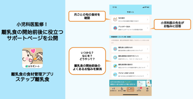 「家族の健康を支え笑顔をふやす」をビジョンとし、家族と向き合う全ての人のアシスタントとして心身ともに健康な生活を支援する事業会社である株式会社カラダノート(東京都港区/代表:佐藤竜也/以下当社)が開発・運営する離乳食の進め方がわかるアプリ『ステップ離乳食』にて、離乳食の準備期間・開始後の進め方に特化した新コンテンツ「サポート」を公開いたしました。当取り組みを通じて、離乳食の悩みや不安解消に努めてまいります。