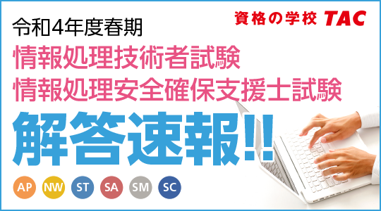資格の学校TACが、4/17(日)に実施される「令和4年度春期 情報処理技術者試験・情報処理安全確保支援士試験」の解答速報を、4/19(火)より順次TACホームページで公開いたします。