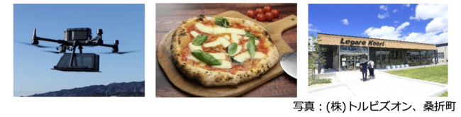実証実験で使用する機体(DJI M300)、配送するピザのイメージ、レガーレこおり外観