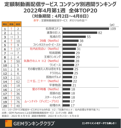 エンタテイメント業界に向けたデータ×デジタルマーケティングサービスを提供するGEM Partners株式会社(ジェムパートナーズ、所在地:東京都港区、代表取締役:梅津文)は4月15日(金)、エンタメコンテンツランキングやデータ情報を発信する「GEMランキングクラブ」プロジェクトにて作成した2022年4月第1週の「定額制動画配信サービス コンテンツ別週間ランキングTOP20(実査日:2022年4月9日、調査対象期間:4月2日~4月8日)」を発表します。