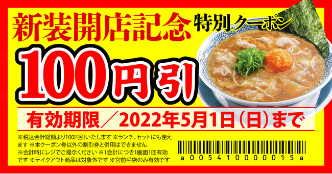 オープン記念として、2022年5月1日(日)までご利用いただける『丸源ラーメン 宮前平店』限定の100円引クーポンをwebにて配信いたします。