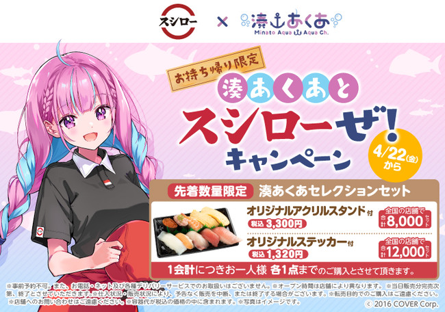 株式会社あきんどスシロー(本社:大阪府吹田市、代表取締役社長:新居 耕平)は、昨今の飲食シーンにおいて多くの生活者の中で中食(なかしょく)を中心とした“新しい生活様式”が定着していることを踏まえ、テイクアウト事業にも力を入れて取り組んでおります。この度、カバー株式会社(本社:東京都千代田区、代表取締役社長:谷郷 元昭)が運営する女性VTuberグループ『ホロライブ』所属の『湊あくあ』さんとコラボレーションしたお持ち帰り限定商品「湊あくあセレクションセット」を4月22日(金)より、全国※のスシローにて数量限定で販売いたします。そして、コラボのために特別に描き下ろされたイラストを初披露いたします。