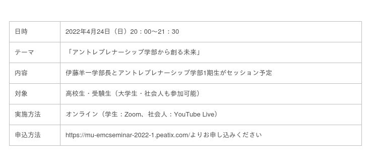 ■武蔵野EMC高校生オンラインゼミ(Peatix):https://mu-emc.peatix.com/