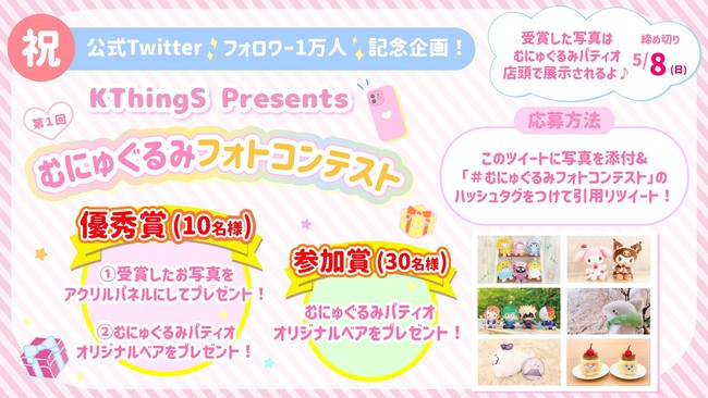 KThingS公式Twitterフォロワー様1万人突破を記念して、第1回「むにゅぐるみフォトコンテスト」を開催中!5月8日までに”むにゅぐるみ”の写真を撮影して応募しちゃおう♪優秀賞の写真はアクリルパネルにしてプレゼント!むにゅぐるみパティオ店頭で展示も行います。参加賞も要チェック☆