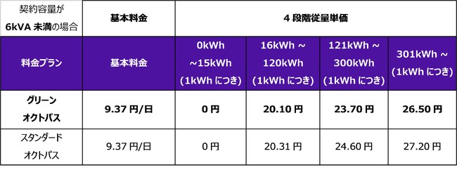 今回追加された関西エリア向け料金プランは、契約容量が6kVA未満の場合は日割で計算される一定の基本料金と、使用量に応じて計算される4段階従量単価を、契約容量が6kVA以上の場合は契約容量に応じた基本料金と、使用量に応じて計算される3段階従量単価を採用しています。