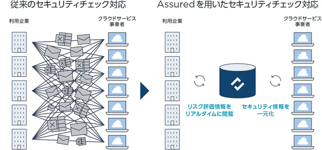 Assuredは、国内外のクラウドサービスのセキュリティリスク評価情報を一元化したデータベースです。これにより、従来クラウドサービス利用企業・提供企業間で個別に行われてきたリスク評価業務を削減し、安全なクラウド利用・提供を促進いたします。