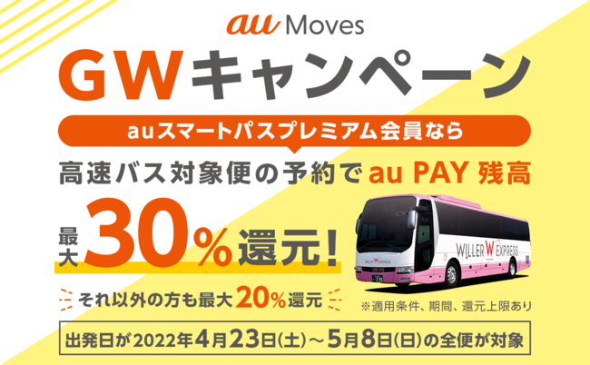 「auスマートパスプレミアム」は、エンタメ体験やショッピング割引など、 「おトク」な生活を提供する全てのスマホに対応した月額サービス。au PAY アプリで交通サービスの予約、決済が完結するサービス「au Moves 高速バス」にて、2022年4月23日(土)から2022年5月8日(日)までが出発日の全便を対象に、auスマートパスプレミアム会員なら30%のau PAY残高を還元するキャンペーン「au Moves ゴールデンウィークキャンペーン」を実施します。予約受付は2022年4月21日(木)から開始します。
