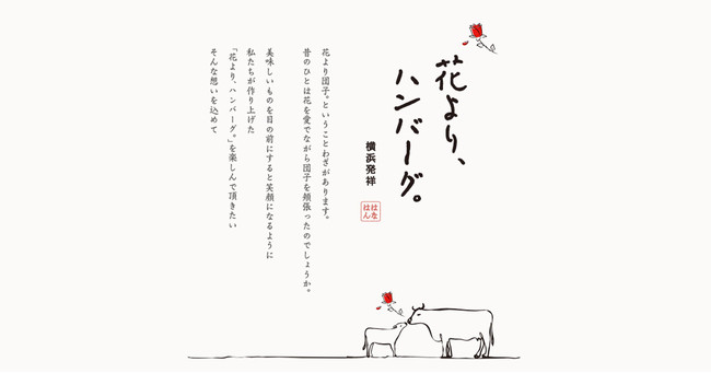 美味しいものを目の前にすると笑顔になるように、私たちが作り上げた 「花より、ハンバーグ。」を楽しんで頂きたい。そんな想いを込めて。