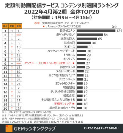 エンタテイメント業界に向けたデータ×デジタルマーケティングサービスを提供するGEM Partners株式会社(ジェムパートナーズ、所在地:東京都港区、代表取締役:梅津文)は4月21日(木)、エンタメコンテンツランキングやデータ情報を発信する「GEMランキングクラブ」プロジェクトにて作成した2022年4月第2週の「定額制動画配信サービス コンテンツ別週間ランキングTOP20(実査日:2022年4月16日、調査対象期間:4月9日~4月15日)」を発表します。