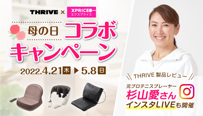 5月8日の母の日に向け、人気ヘルスケアブランド「THRIVE(スライヴ)」と家電EC「XPRICE」が豪華なコラボキャンペーンを開催します。「THRIVE」イメージキャラクターを務める元プロテニスプレーヤー杉山愛さんによるスペシャルインスタLIVEや、人気マッサージチェアなどのプレゼント企画、限定クーポンなど、今回のコラボキャンペーンだけのオリジナルイベントが満載です。杉山愛さんのインスタLIVEでは、マッサージチェアなど「THRIVE」各製品の使用感をレビューしていただきます。