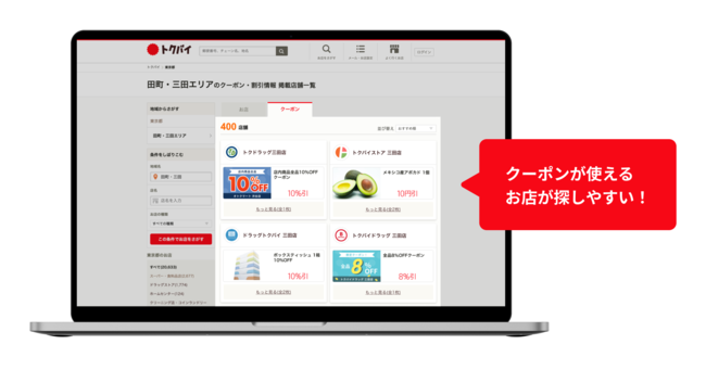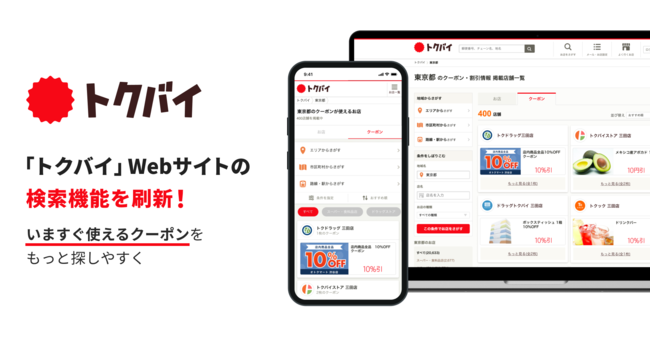 くふうグループにおいて、チラシ・買い物情報サービス「トクバイ」を運営する株式会社ロコガイド(以下「ロコガイド」)は、Webサイト「トクバイ」において、ユーザーからのニーズの高い「クーポン」専用タブを新たに設置し、対象エリアのクーポンを一覧で表示できるようになりました。また、決済方法や営業時間、駐車場有無などを条件に絞り込み検索ができるようになり、便利でお得なクーポンやチラシ情報をますます探しやすくなりました。