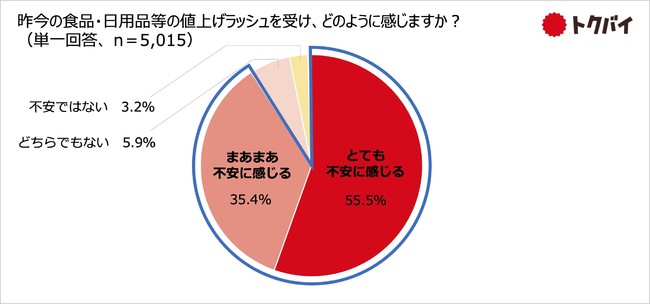 昨今の日用品・食品等の値上げラッシュをどのように感じるかたずねたところ、「とても不安に感じる」との回答が55.5%、「まあまあ不安に感じる」が35.4%、合わせて9割超となりました。