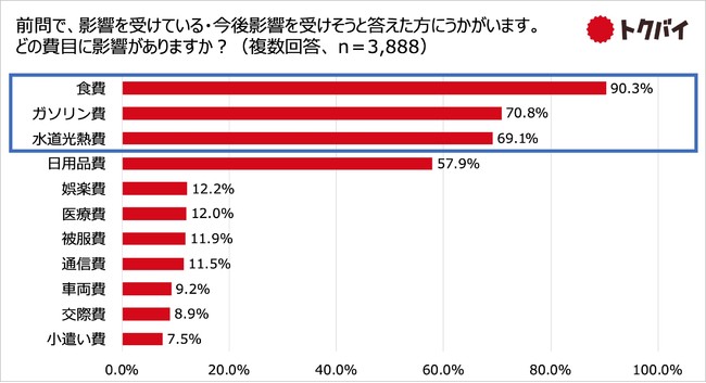 また、影響を受けている(受けそう)と回答した方へ、具体的にどのようなものに影響があるか(ありそうか)たずねたところ、「食費」との回答が90.3%、次いで「ガソリン費」が70.8%、「水道光熱費」が69.1%となりました。日常生活に欠かせない費目を中心に影響が出ていることがうかがえます。