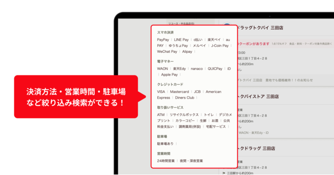 2.そのほか決済方法や営業時間、駐車場有無などの条件での絞り込み検索が可能に!