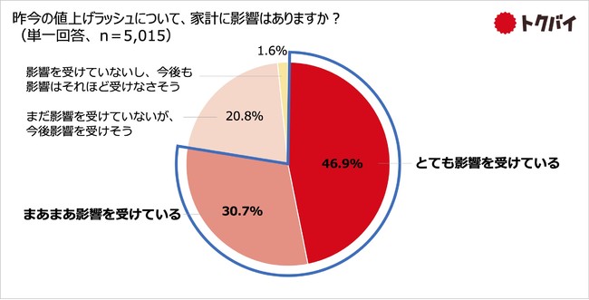 家計への影響についてたずねたところ、「とても影響を受けている」との回答が46.9%、「まあまあ影響を受けている」が30.7%となり、合計で約8割に上りました。さらに、「まだ影響を受けていないが、今後影響を受けそう」との回答が20.8%となりました。