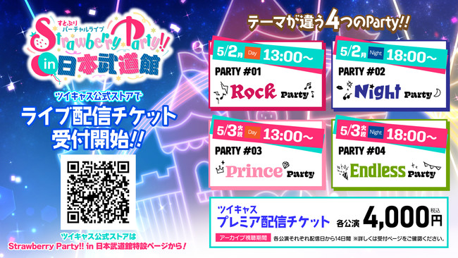 テーマが違う4つのParty!!「Strawberry Party!! in 日本武道館」全公演のライブ配信チケット、本日よりツイキャスで発売!