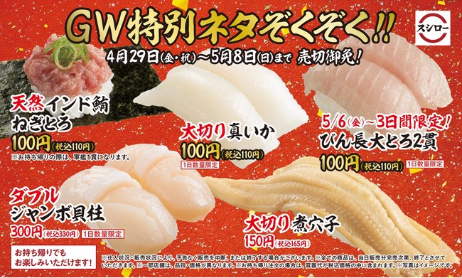 株式会社あきんどスシロー(本社:大阪府吹田市、代表取締役社長:新居 耕平)は4月29日(金・祝)より、皆様にもっとスシローでGWを楽しんでいただくため、現在開催中の『ゴールデン・ウィークコラボ祭』の商品に追加して、お得な『GW特別ネタ』を全国※のスシローで販売いたします。