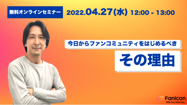会員制ファンコミュニティプラットフォーム「Fanicon」を運営するTHECOO株式会社(本社:東京都渋谷区、代表取締役CEO:平良真人、証券コード:4255)は、2022年4月27日(水)12:00~13:00よりエンタメ業界関係者に向けた無料ウェビナー「今日からファンコミュニティをはじめるべきその理由」を開催いたします。