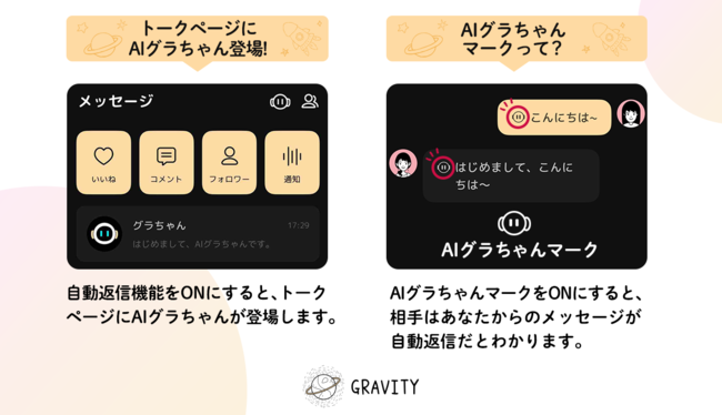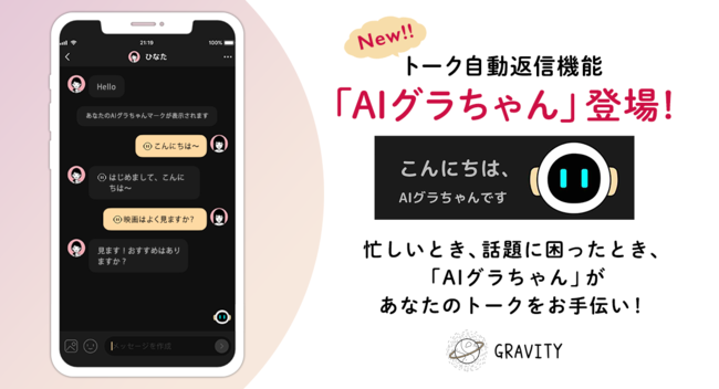 HiClub株式会社(本社:東京都港区、代表取締役社長:梶野剛)が提供する、 共感で繋がるSNS 「GRAVITY」(グラビティ)(iOS、Android版)は、よりスムーズなコミュニケーションがとれるよう、独自のAI技術を活用したメッセージ自動返信機能「AIグラちゃん」をリリースしました。