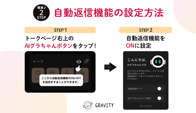 GRAIVTYは、共感しあえる人と繋がり、スムーズなコミュニケーションができるよう開発を進めてきました。DL数100万を突破し多くの方にご利用いただく中で、「メッセージが気になるけど忙しくてGRAVITYを開けない時がある」「仲良くなりたい相手と話す話題について困った」というお声をいただきました。そのため、昨年より注力してきたメタバースに弊社独自のAI技術をかけあわせた新機能「AIグラちゃん」をリリースする運びとなりました。あなたのトークのお手伝いをする自動返信機能をぜひご活用ください!