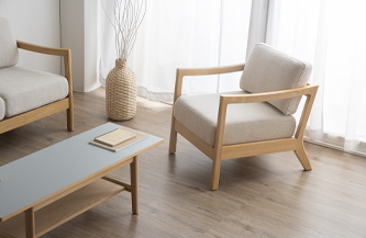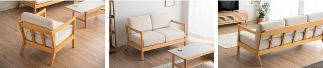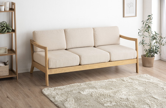 「タンスのゲン」の天然木フレームのソファに新色登場~天然木とペールアイボリー生地の組合せでナチュラルな空間に