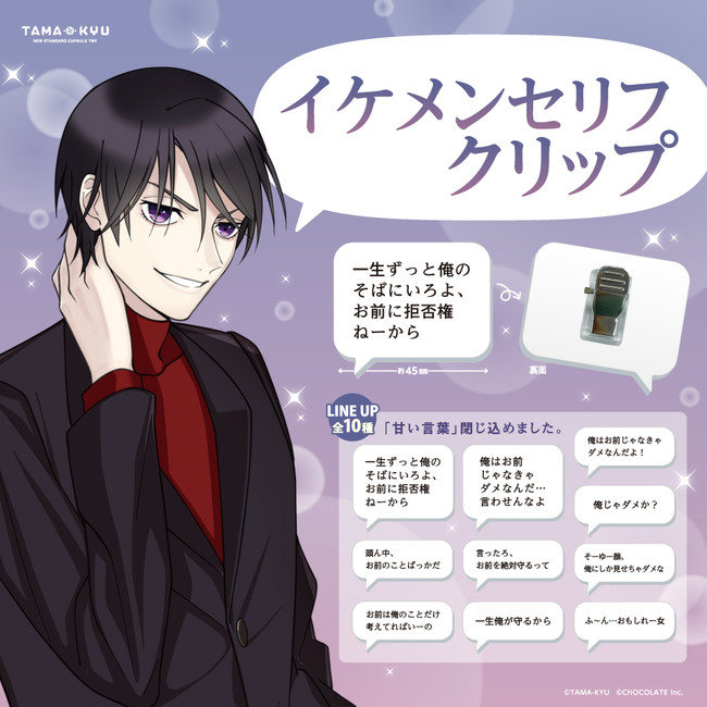 株式会社ブシロード(本社:東京都中野区、代表取締役社長:橋本義賢、以下ブシロード)のグループ会社にあたる株式会社ブシロードクリエイティブ(本社:東京都中野区、代表取締役社長:成田耕祐)は、オリジナルカプセルトイブランド『TAMA-KYU(たまきゅう)』から、コンテンツスタジオCHOCOLATE Inc.(本社:東京都渋谷区、代表取締役:渡辺裕介)企画の「イケメンセリフクリップ」を全国のカプセルトイ自販機にて2022年4月27日(水)より順次販売を開始いたします。