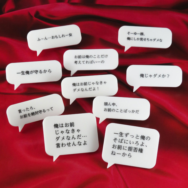 俗にいう“イケメン”が言いそうなセリフを吹き出し型のアクリルにデザインし、さまざまな所に挟んで使えるクリップにしちゃいました。